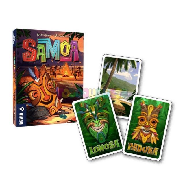Hay una fiesta en la isla Y dura una semana entera! En la playa hay 5 máscaras de madera pintadas de colores vivos y os dedicáis a recoger plumas de colores en para decorarlas. Tenéis que hacer que queden preciosas, cuantas más plumas, mejor. Eso sí, las plumas negras traen mala suerte. A veces el viento se lleva una pluma, y otras veces alguna de las plumas se quema con las llamas de las hogueras. Tenéis que intentar por encima de todo que vuestra máscara favorita quede lo más bonita posible pero nadie puede saber cuál es. Sabéis qué máscara están decorando los demás Y lograréis evitar que los demás sepan cuál estáis decorando vosotrosDiseñado por Lars Jansen e ilustrado por Andrew Bosley (Everdell, Tapestry, Love Letter), Samoa es un divertido juego de cartas con mecánicas de deducción y forzar la suerte que cuenta con una buena dosis de faroleo, en el que nada es lo que parece. Todos los jugadores compiten por ganar el mayor número de puntos a lo largo de tres rondas.Cada jugador tiene una máscara favorita, pero el resto no sabe cuál es. Su objetivo es decorar la propia con tantas plumas de colores como sea posible para sumar puntos, pero sin despertar las sospechas del resto. Para decorar las máscaras, se colocan cartas en la parte superior e inferior de una máscara. Habrá cartas que sumarán más puntos y otras que incluso restarán. Al final de la ronda, los jugadores tratarán de adivinar qué máscara tiene cada uno y si lo consiguen, obtendrán puntos de bonificación. Sin embargo, si los demás llegan a descubrir la máscara de un jugador, este no podrá sumar puntos.Con muy pocas reglas, pero con mucho que ofrecer, Samoa es un juego perfecto para jugar con familia y amigos. Y no os guieis por la edad recomendada de la caja Para adaptar el nivel de dificultad al grupo de juego, el reglamento ofrece algunos ajustes de normas para que los más pequeños puedan disfrutar de la experiencia.Samoa es uno de los nuevos títulos de la colección pocket de Devir, una línea de juegos de pequeño formato y coste reducido que son ideales para llevar a cualquier parte. Lograrás despistar a tus oponentes y bailar con la máscara más bonita de la playaEdad recomendada a partir de 10 años.
