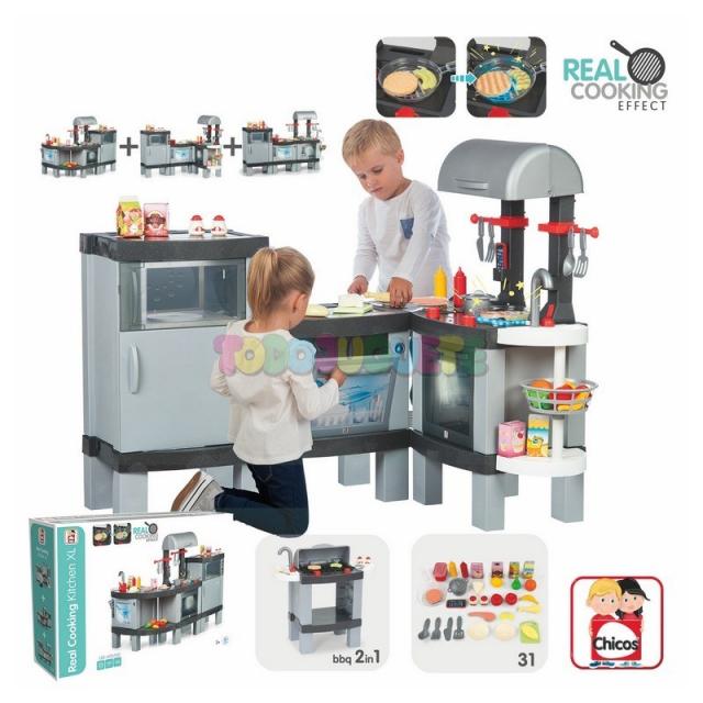 Tecnología termocrómica. Decide el punto de cocción. Los alimentos cambian de color cuando se cocinan en el fogón de LED y además tiene sonido.Gran cocina modular con tres módulos que ofrecen diferentes configuraciones.Módulo cocina, horno y campana extractora; módulo con microondas y frigorífico; y módulo auxiliar armario y fregadero.Incluye 31 piezas.Medidas 120×94.8×100 cms.Edad recomendada a partir de 3 años.